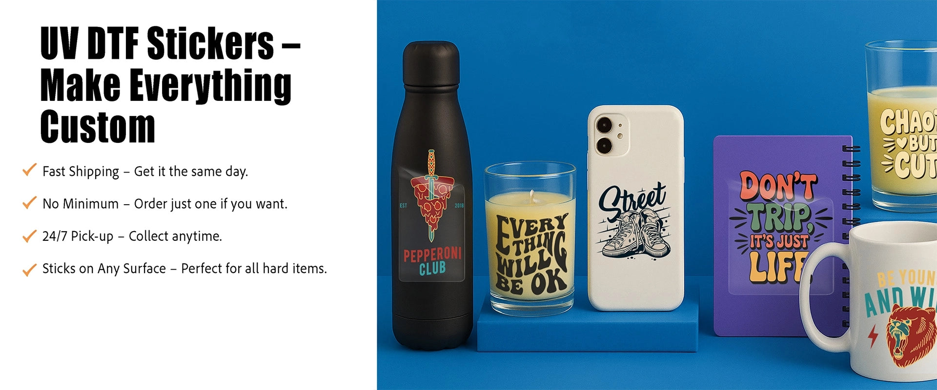 For the best results, we recommend vector art, and if using raster art, ensure it's at least 300 dpi. Preferred file formats include .AI, .PDF, and .EPS, while we also accept .JPG and .PNG files.