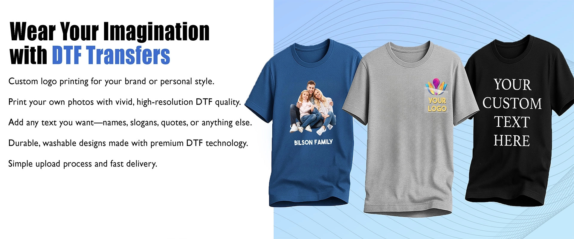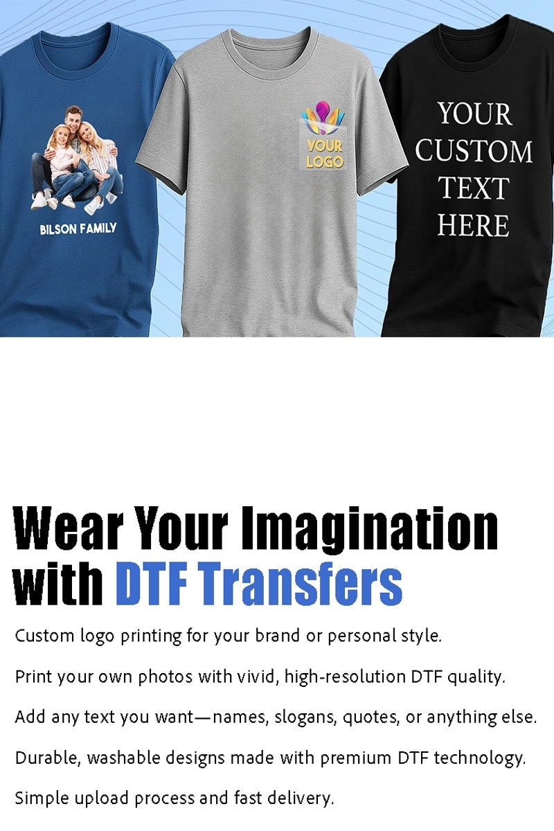 Direct To Film (DTF) is a printing method that involves printing designs of any color directly onto a special film, which is then applied to different materials such as cotton, polyester, and linen. With a simple heat press process lasting 7 to 12 seconds, this technique allows for seamless printing on virtually any fabric.