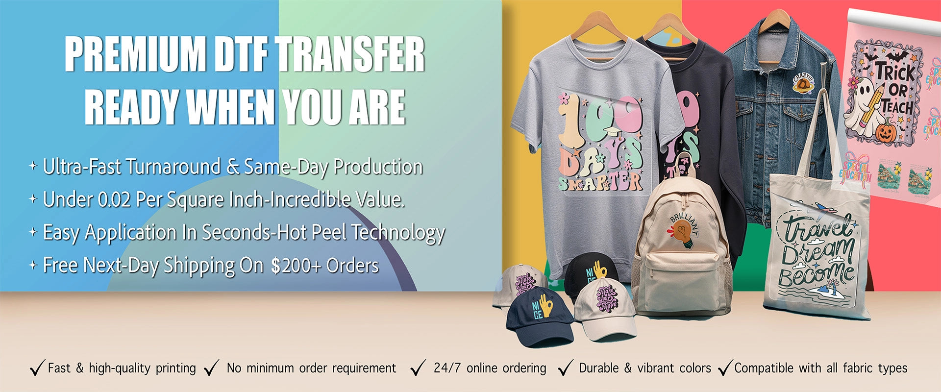 We have thoroughly tested our transfers on a variety of garments. The stretch test demonstrates that both DTF and UV DTF transfers maintain their integrity without cracking under reasonable stretching. Furthermore, they have endured more than 50 wash cycles, with our advanced process helping to reduce wear and fading.